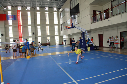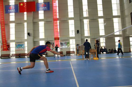 “友谊第一、比赛第二、热情参与、团结进步”。现场醒目的红色条幅,道出了全体参赛运动员的心声:大家既是对手,更是朋友、同事;场上剑拔弩张,场下握手言和。比赛开始后,场内竞争激烈,各队队员奋力拼搏,每球必争。赛场上,参赛选手们充满激情,尽情挥舞着手中的球拍,轻盈的羽毛球在场上不断翻飞跳跃。男选手们挥汗如雨,奋力拼杀;女选手们巧妙灵活,沉稳应战。选手们一次次高高跃起的精彩扣杀,一个个细腻灵巧的网前挑球……积极施展自己的技艺,对决异常紧张激烈,各种战术的灵活运用,扣人心弦的比赛让现场观众都为之聚气凝神。
