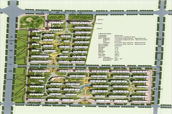 2、主要经济技术指标:该项目总用地面积350亩,总建筑面积约282766平米,计划建设高层住宅、多层住宅、地下车库等,小区绿地率达到35.2%,并建有地上泊车位、地下车库和架空层车位共计1263个,总户数1585户。