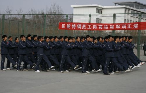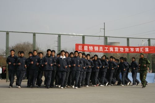 “报告领导,特钢公司新员工岗前培训军训汇演准备完毕,是否开始,请指示!”随着教官洪亮的报告声,特钢公司380余名新员工岗前培训军训汇演拉开了序幕。